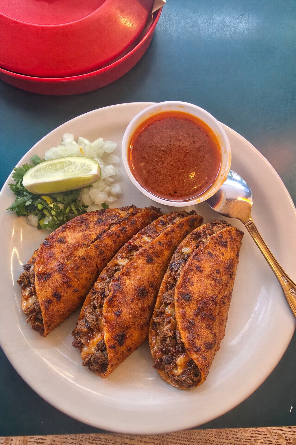 Crispy grilled tortillas filled with slow-cooked birria beef and melted cheese, served with rich birria consome for dipping.