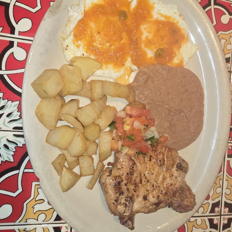 Steak pieces grilled with jalapeños, onions, and tomatoes, topped with ranchera sauce, with rice and refried beans. Sub charro beans.
